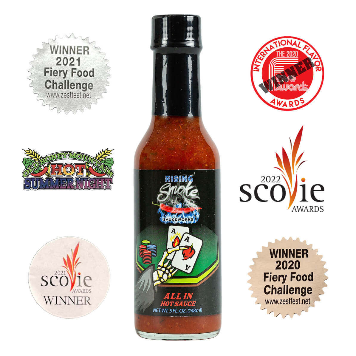 All In is our boldest and most intense hot sauce experience yet. Brace yourself for a fiery fusion of habaneros and ghost peppers, followed by the relentless heat of smoked Carolina Reapers. But this sauce is not just about the scorch β it's a symphony of smoky and savory flavors, thanks to a carefully crafted blend of tomatoes, spices, and a touch of red wine vinegar. Perfect for true chili heads seeking both heat and depth of taste, "All In" is a flavor-packed adventure that ignites your senses from the first drop.