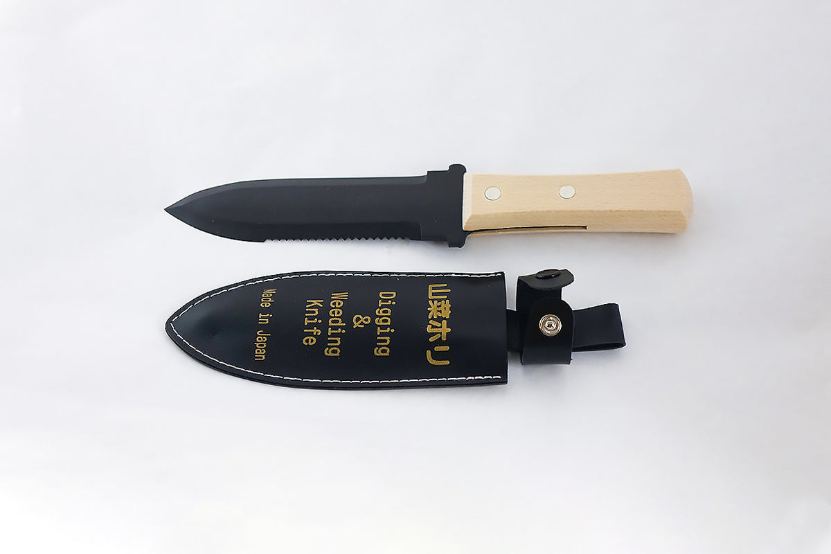 An all-purpose digging knife used for digging, transplanting, weeding and cutting. The carbon-steel blade is strong and can deal with heavy-duty digging, especially in clay soils. One side is serrated to make cutting weeds and small branches easier. The Hori Hori knife comes in a vinyl sheath.